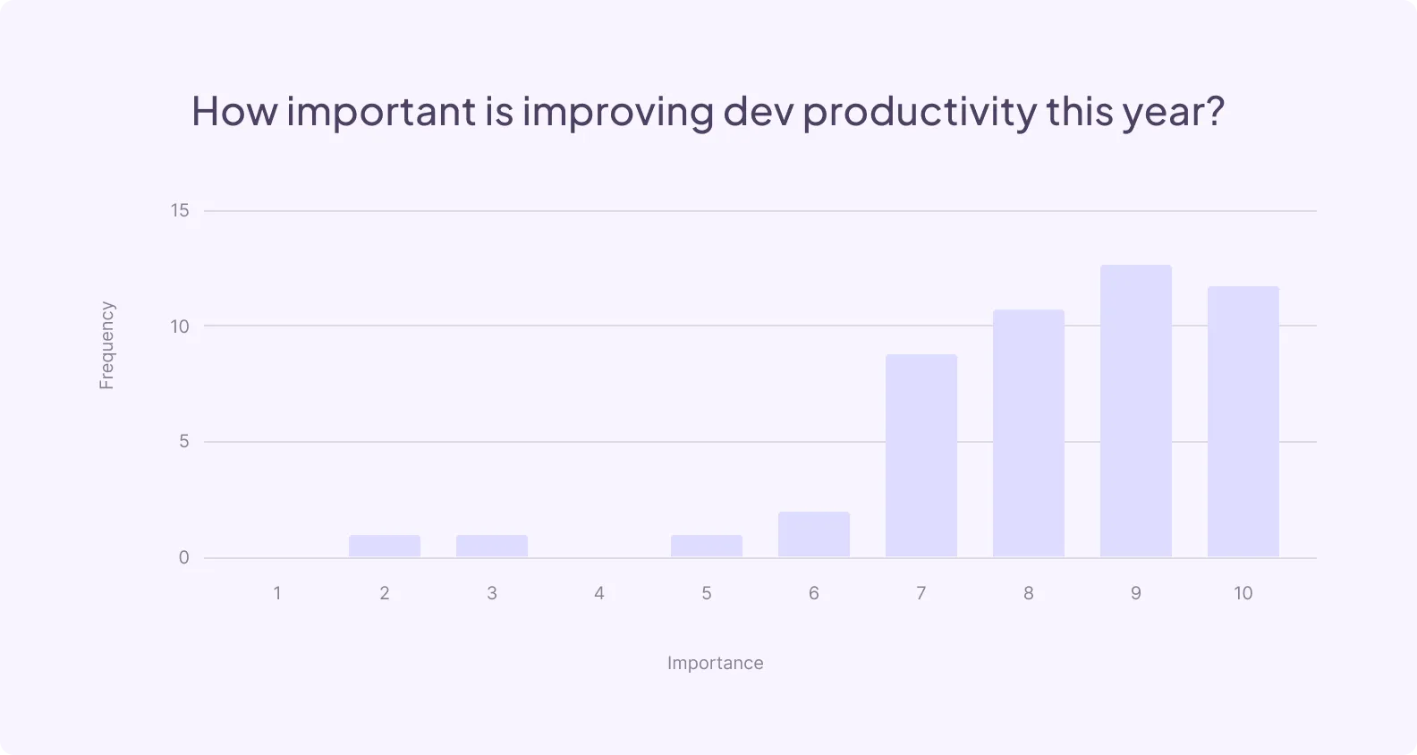 When asked how important it is to improve developer productivity this year, most respondents selected 9 out of 10, with an 8.2 average. 55% of those stating 9 or 10 also said their team loses 5-15 hours per dev per week to unproductive work—which certainly warrants priority attention. And while only two respondents said productivity was not a major focus, both still estimated weekly time lost to unproductive work to be 3-5 hours and 5-15 hours respectively.