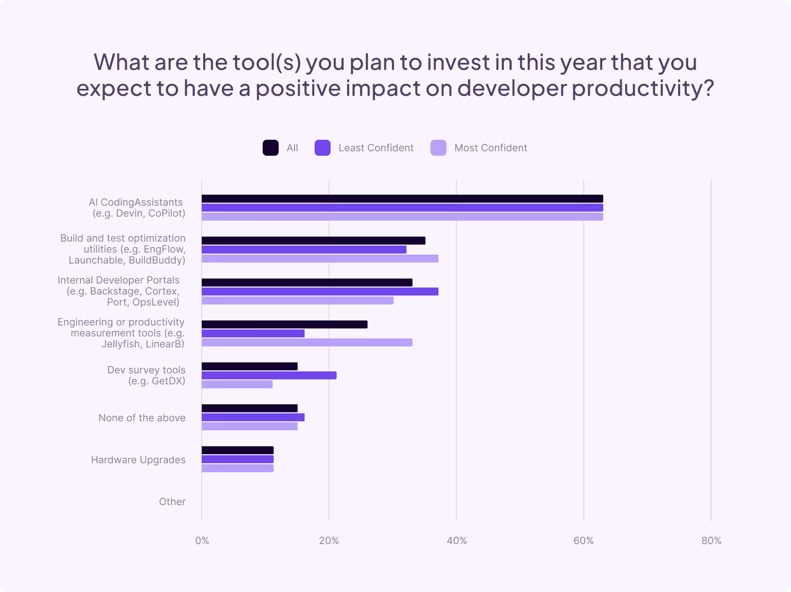 Participants were asked, “Which tool(s) do you plan to invest in this year that you expect to have a positive impact on developer productivity?” Interestingly, while “writing code” was not rated an area of high productivity leak—except by those with the highest confidence in their team’s existing level of productivity, coding assistants are rated as the #1 area of investment, even for teams with below-average confidence in productivity, and those rating time to gather context as a top productivity leak.