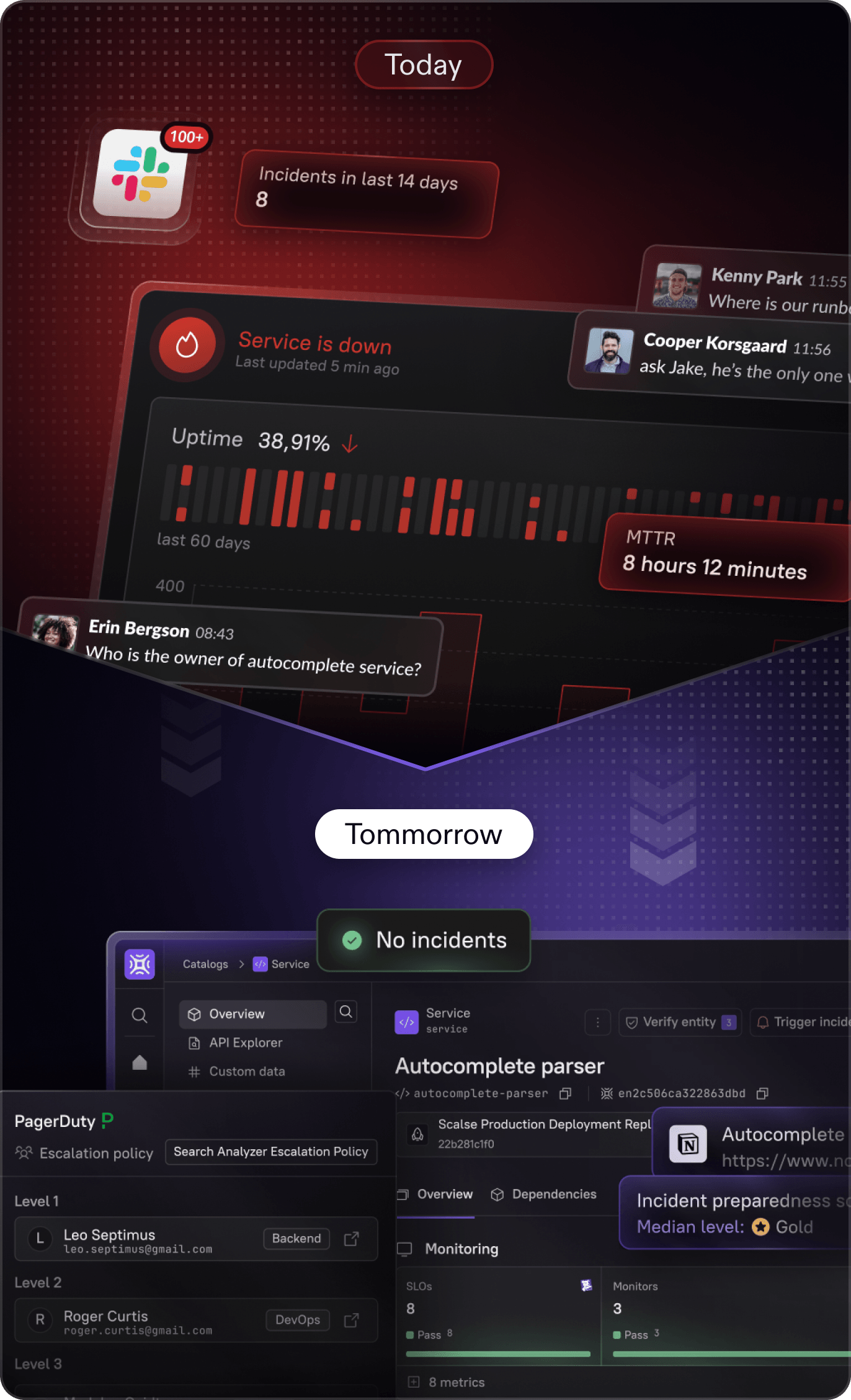 Centralize ownership, monitoring, and runbooks into a single source of truth so teams always have the right context during an incident.